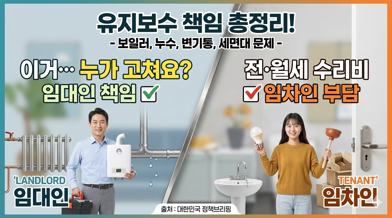 오늘은 대한민국 정책브리핑 자료를 바탕으로 임대인(집주인)과 임차인(세입자)의 수리 책임 범위를 명확하게 정리해 드립니다. 1,500자 이상의 상세한 안내를 통해 수리비 분쟁에서 현명하게 대처하는 방법을 알아보세요.