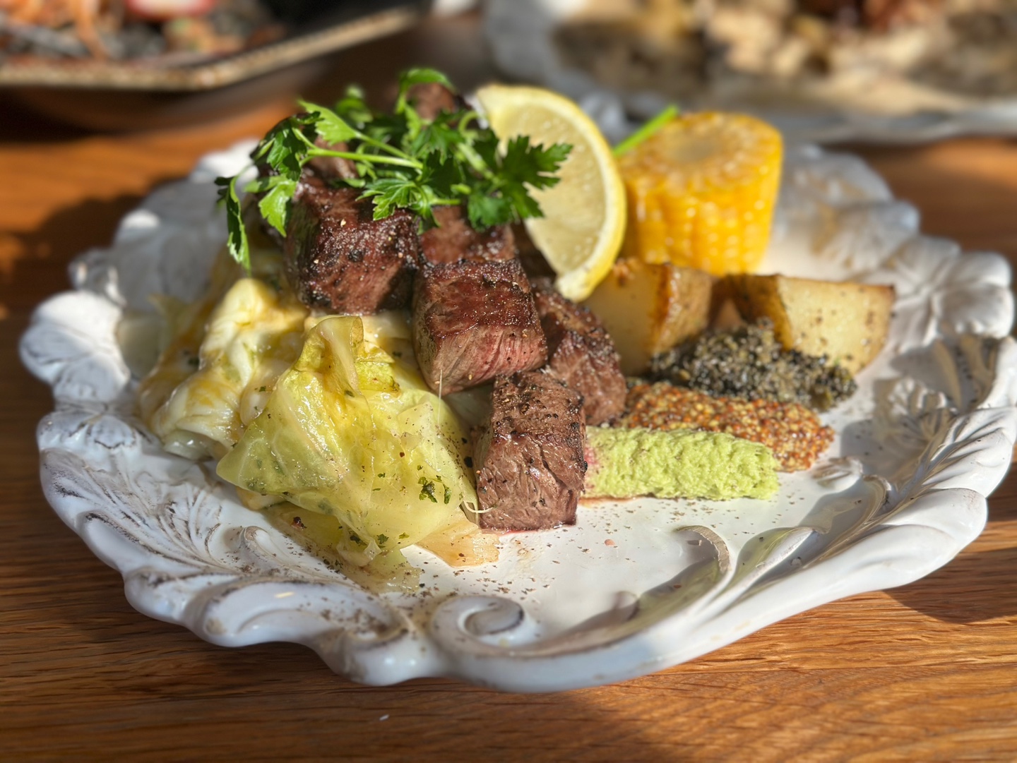 - 살치살 스테이크 (43.0): 부드러운 살치살에 양배추 치즈구이, 감자, 옥수수가 곁들여진 메인 요리입니다.