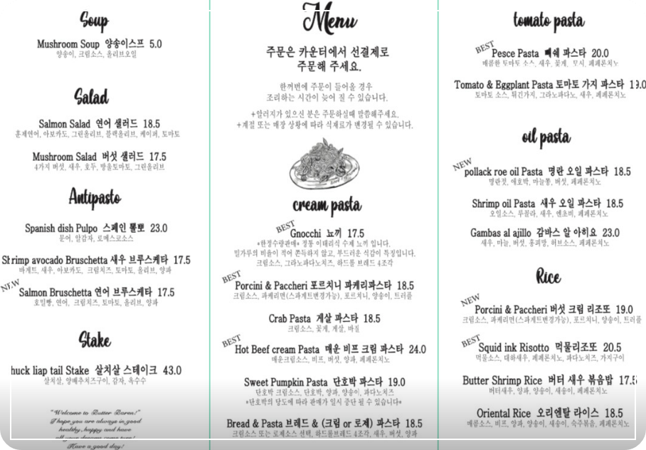 메뉴판을 보시면 아시겠지만, 수프부터 샐러드, 파스타, 스테이크, 리조또까지 정말 알찬 구성을 자랑합니다.