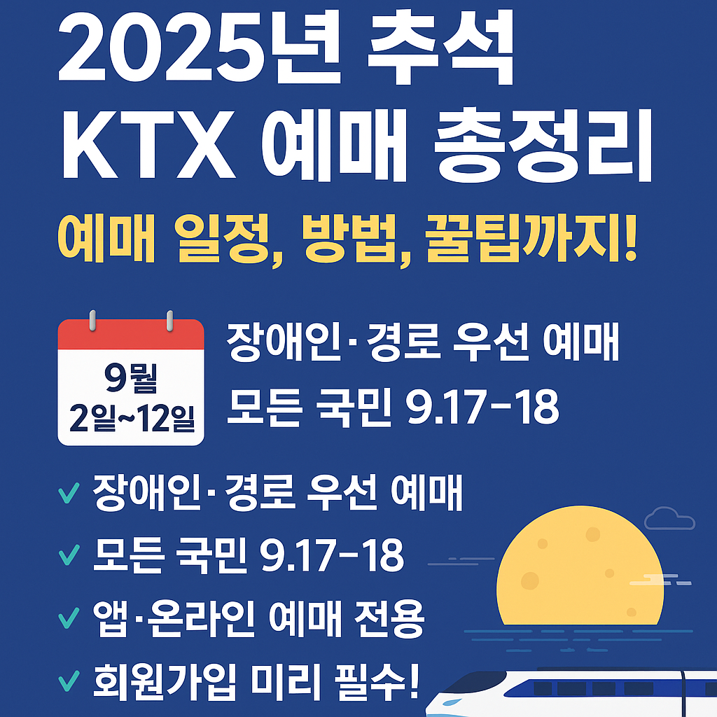 2025년 추석 연휴는 최대 11일간의 황금연휴입니다. 귀성·귀경 계획이 있다면 KTX 추석 예매 일정을 미리 숙지하시고, 가능한 한 예매 시작 직후 빠르게 시도해보세요!